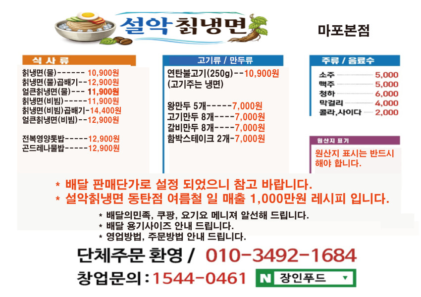 설악칡냉면 메뉴